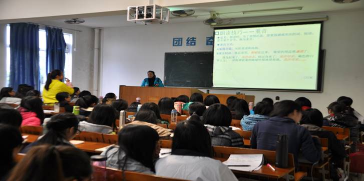 本网讯(记者马晓玲 凌小媛)12月9日,公司邀请了端城小学特级教师凌琳在第二教学楼503室开展了小学语文教学法之朗读技巧讲座。公司廖洁敏老师、慕容勋老师出席了本次讲座。14小学教育班、14初等教育班和13小学教育班的同学也参加了讲座。