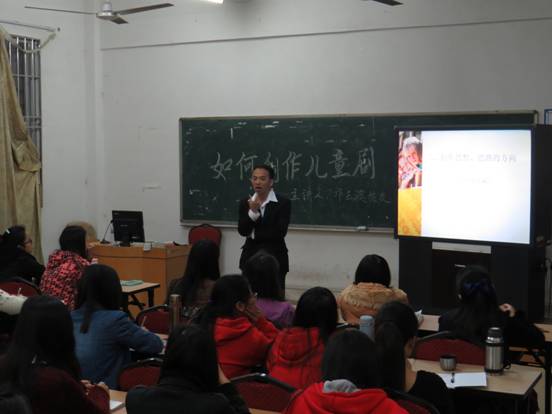 邝园长从熟悉幼儿、创作思路、角色塑造、表现形式、故事的时间与空间背景及语言表达六个方面为同学们讲解了如何创作及改编儿童剧。要想创作好的儿童剧,首先要熟悉幼儿的生活,贴近儿童的心理。接着要明确创作思想及创作的方向,并举出了“蚂蚁搬家”的例子,让同学们能更容易地理解。在塑造角色时,为了突出主角或主要人物,可以运用对比法来让角色的形象更鲜明。在塑造好角色后,可以使用音乐、舞蹈等多种表现形式。其次,故事的时间与空间背景可以灵活多变的,发挥出最大的想象力。在完成剧本后,还要检查剧本中语言的表达要是否符合儿童的特征,对白要儿童化。