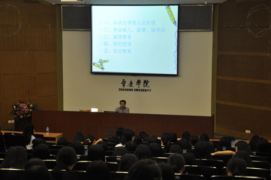 本次会议议程有:一、刘远君副书记对新生进行的校纪校规、安全、诚实守信、社会公德教育;二、黄华老师对新生进行大学学习生活适应及励志教育;三、新生代表宣读《安全文明诚信承诺书》;四、全体新生共同签订《安全文明诚信承诺书》。