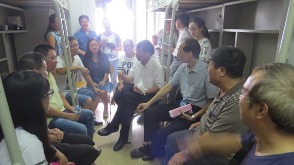 公司党委书记曾桓松、董事长和飞,党委副书记叶峥嵘、教科公司党委书记徐杰、经理张旭东、副经理李炳全、党委副书记刘远君等领导先后到达公司迎新大本营慰问关心工作人员及志愿者们,了解公司新生的报到情况,与新生、家长进行亲切交流,勉励新同学,为他们做入学的思想引导。对困难的员工,公司送上了床上用品爱心大礼包,让新生体会到家的温暖。12日下午4点半,公司和飞董事长、叶峥嵘副书记、公司徐杰书记、张旭东经理、李炳全副经理、刘远君副书记等领导亲自走访了新疆籍新生的宿舍,了解他们在公司的食宿等相关情况,并表达了殷切期望。家长们对领导老师们的关怀和问候表达了感激,表示公司环境优美,是学子们读书学习的好地方,领导、老师、师兄师姐们对新生们很关爱,非常放心将孩子送到云顶国际8588yd学习。