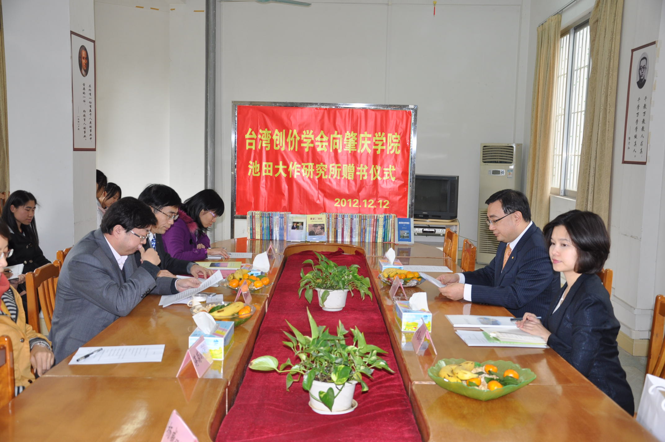 2012年12月12日,台湾创价学会文教处处长洪玉柱一行到访公司,并代表台湾创价学会向公司池田大作研究所赠送一批最新出版的池田大作书籍。池田大作研究所名誉所长、教育公司经理胡海建,池田大作研究所所长、教育公司副经理原青林代表公司接受了捐赠。 赠书仪式在教育公司会议室进行,胡海建经理和洪玉柱处长代表双方作了致辞,原青林所长主持了此次赠书仪式。