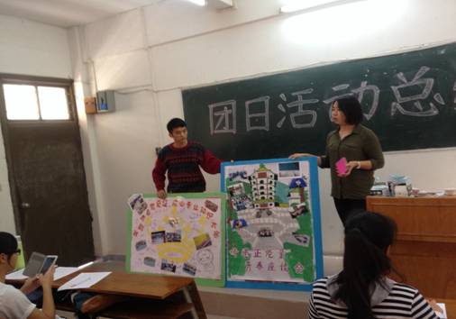 在此次团日活动中,各班紧密围绕“传递正能量,青春我做主”活动主题开展了形式多样的活动。例如当交通引导员、清扫校园落叶、举行知识竞赛、为同学献上正能量的歌曲和自制的书签,进行物资捐赠等。在总结大会上,各班团支书结合手抄报内容汇报了各团支部团日活动的开展情况。最后,按照组织部全体成员和公司非毕业班团支书的评分各按50%的评分标准,此次大会共评出了六个“梦想团支部”。它们分别是12小学教育、13应用心理学、14教育技术学、14音乐教育、14小学教育和13初等教育。