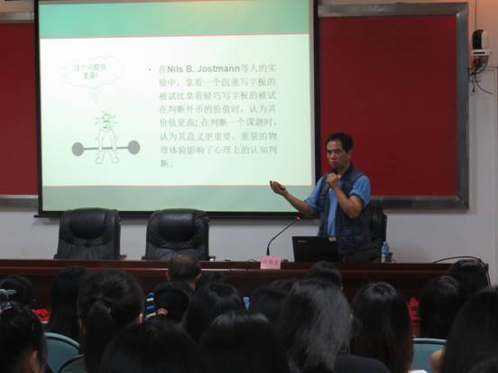 在讲座的后半部分,叶教授为大家生动地介绍了Embodied Cognition(具身认知)的具体例子,并通过穿插中国传统“民以食为天”的文化告诉了同学们身体动作对认知判断的影响。 最后,叶教授分析了具身认知与情绪、人际关系、信念态度等的关系。在本次讲座中,叶教授渊博的知识和诙谐幽默的语言赢得了师生们的阵阵掌声。在提问环节,叶教授详实地解答了部分同学的疑惑。