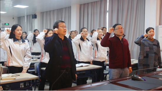 接下来,10名新发展党员依次做党旗下演讲,她们的演讲表达了对党的热爱、对入党的热切追求,并在党旗下做出完善自我、服务他人、追梦奔跑的庄严承诺。何秀华老师在总结中勉励员工党员们一方面党员要有所追求,甘于吃苦、勇于追梦;另一方面要有所坚守,要有四个自信,站稳立场。