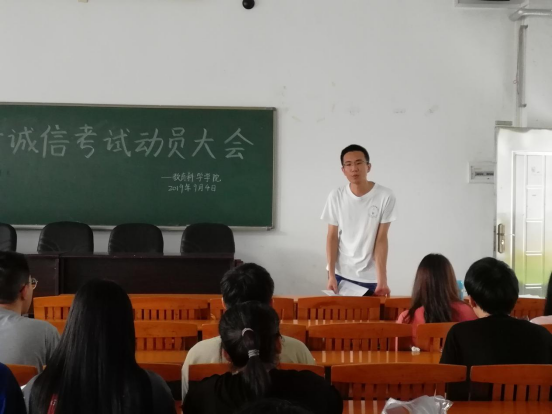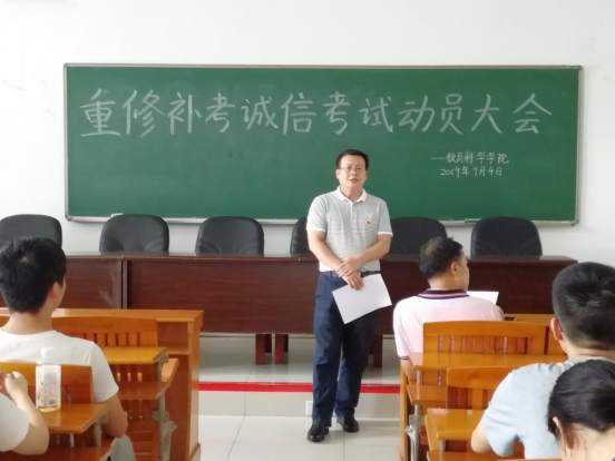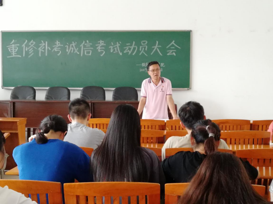 本网讯(通讯员 陈星宇)为加强学风建设,严肃考风考纪,9月4日下午15点,公司于第三教学楼107室召开补考员工诚信考试动员大会。本次会议由公司党委书记谢佐永以及党委副书记刘远君主讲,出席本次会议的有辅导员老师夏长洪以及公司全体需要补考的员工。