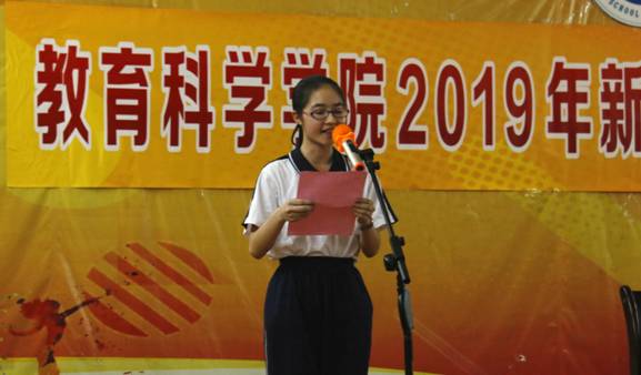 员工代表19级小学教育3班陈育芬在发言中代表全体新生表态,要珍惜在校时光,提高自身技能,开启人生的新篇章。