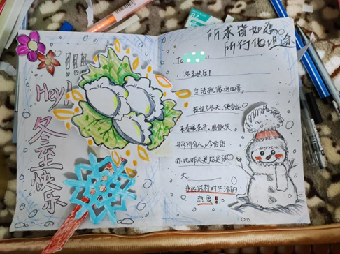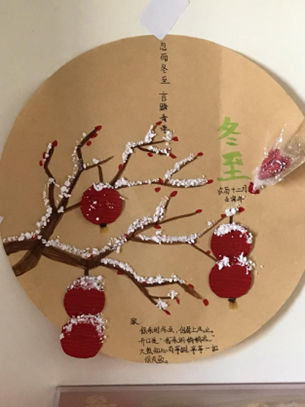 本次活动以制作冬至贺卡的形式开展。在提交的作品中,同学们融入冬至期间的风俗及时节特点,结合贺卡多样化的呈现形式演绎自己对冬至的理解,寄托对家人朋友的思念,表达对生活的美好祝愿。最终经过工作人员的评选,从众多的贺卡中选出6份最符合主题且制作精美的贺卡给予奖项。