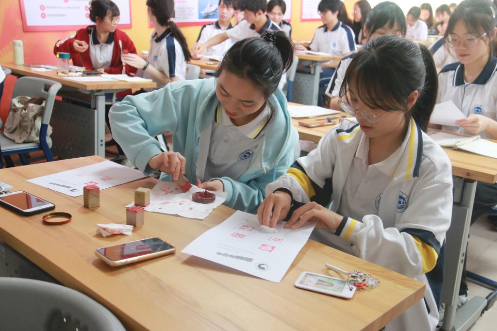 黄老师在讲座中讲篆刻但又不止于此,他指出,无论哪一门学问,最终都是为了培养人的品德,他分享了自己通过篆刻开展中员工感恩教育的教学案例,“唯有心灵美,才能够做好各项职业。”在讲座最后,黄老师向同学们展示了印有“节节高升”、“如鱼得水”、“龙马精神”“后浪推前浪”等成语的印章,向同学们献上美好的祝愿。