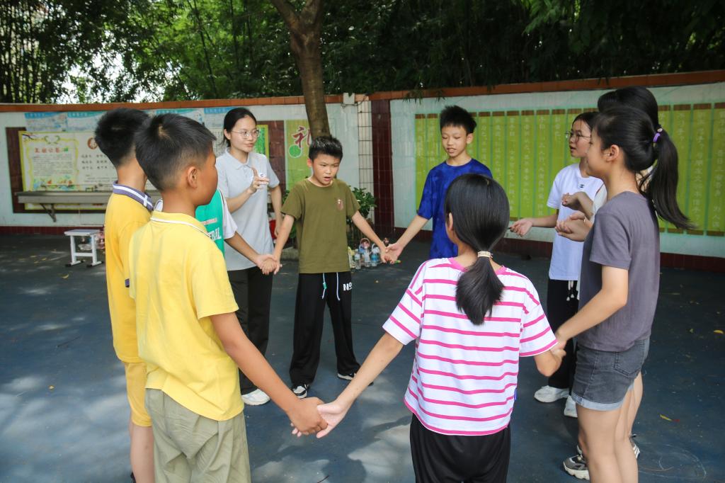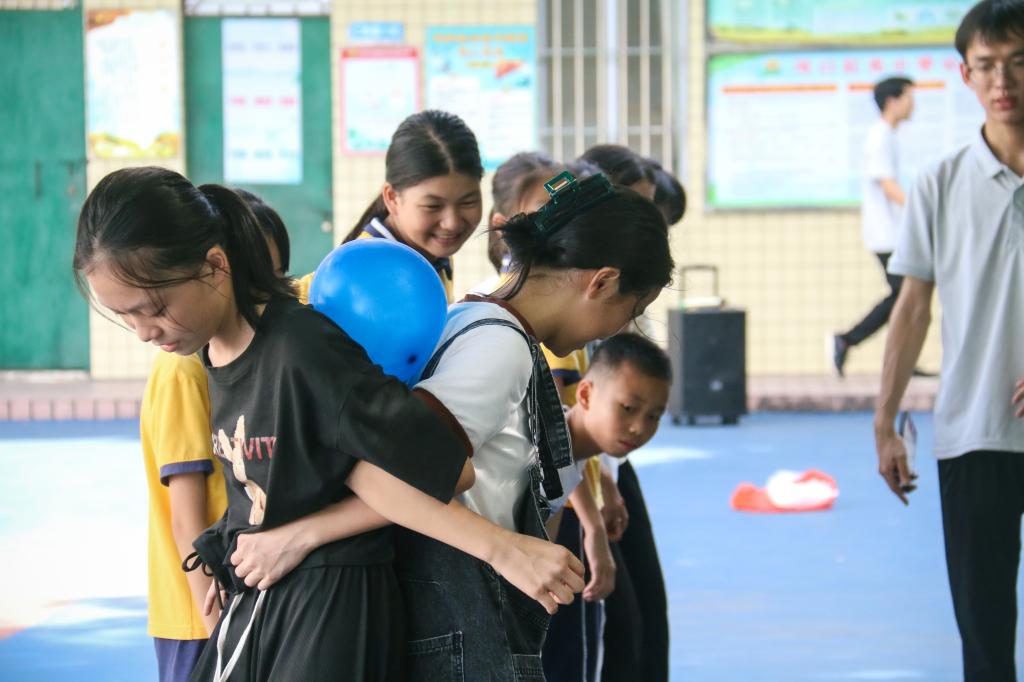 仪式结束后,为建立志愿者与小员工的良好关系,提高员工们的团队凝聚力和抗压能力,志愿者们引领小员工们开展破冰活动。破冰活动包括多项小组游戏,如突破重围、老师说、解手链、你比划我猜等。通过相处与观察,志愿者们在活动中与员工们建立了更加牢固的信任关系,为后续的教学和实践任务奠定了良好的基础。