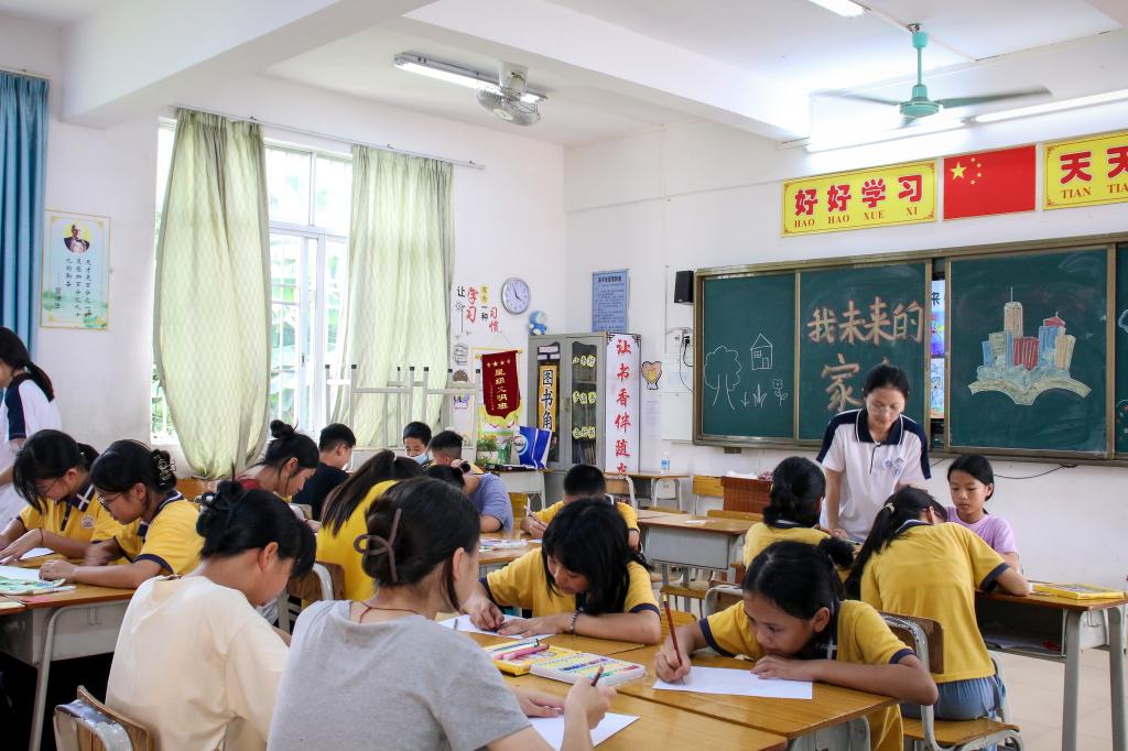 当天,公司义教组志愿者们还开设了系列爱国主义教育课程。志愿者们以歌唱、朗诵和绘画等课程形式,为红光小学的员工们带来了丰富多彩的爱国主义教育课堂。在以“传承红色精神,筑牢复兴之魂”为主题的朗诵课上,志愿者们以邓发故事为引,引领员工学习朗诵《少年中国说》,深刻认识到中国的未来需要每个青年去创造。音乐课上,通过播放歌曲《踏山河》(员工版)片段,分析歌曲内涵,用激昂旋律和歌词中蕴含的红色精神引起员工们的共鸣。此外,志愿者们还开设了“我的家乡”美术课,让小员工们通过绘画来表达自己对家乡的热爱之情,厚植爱国爱乡情怀。