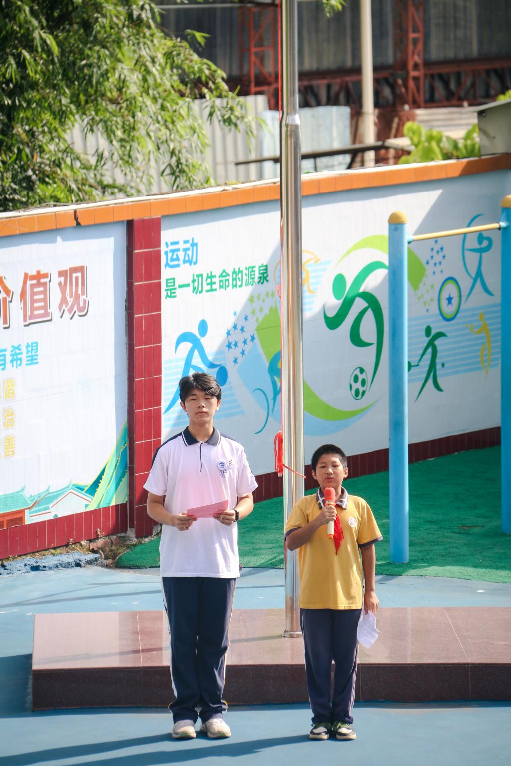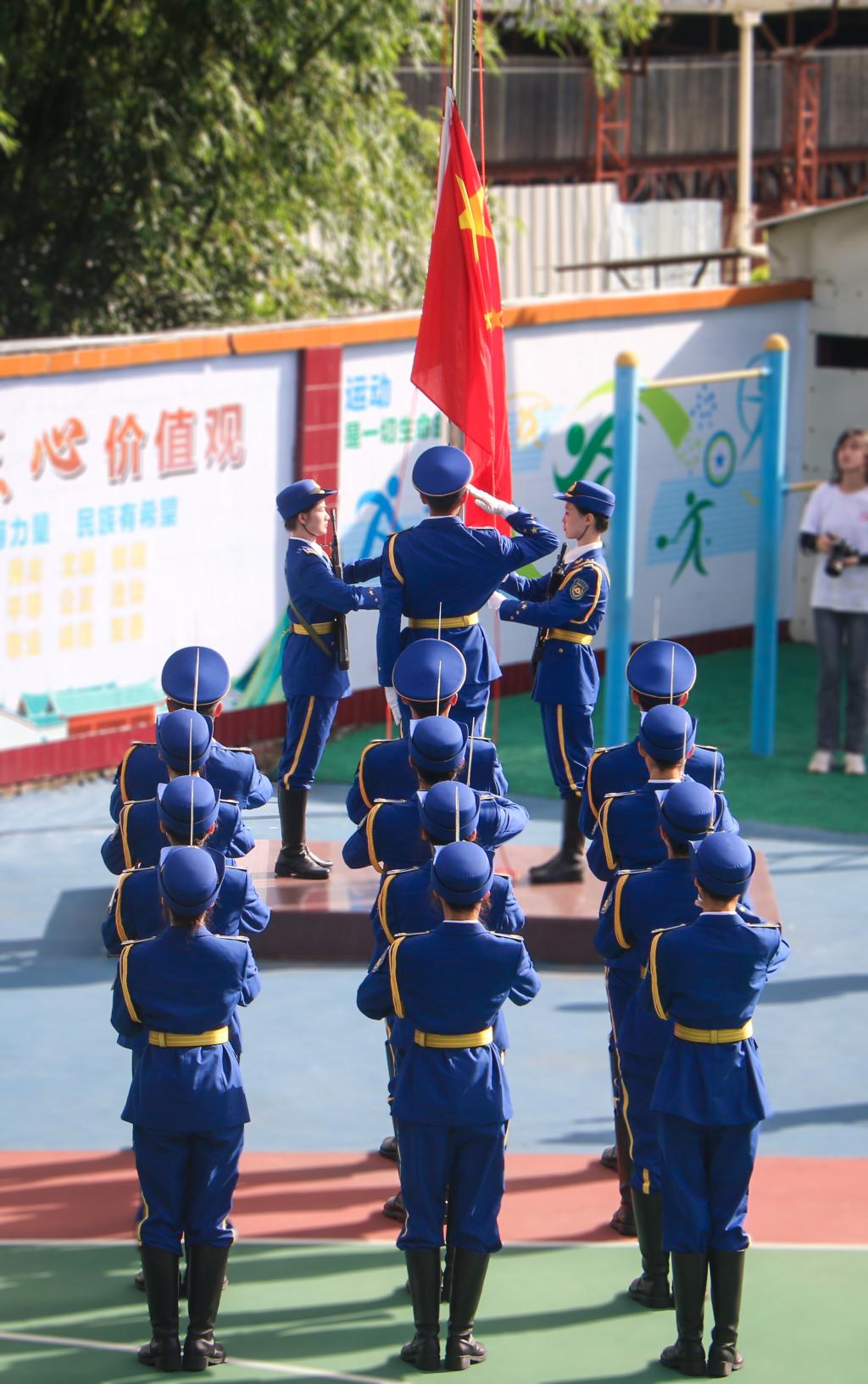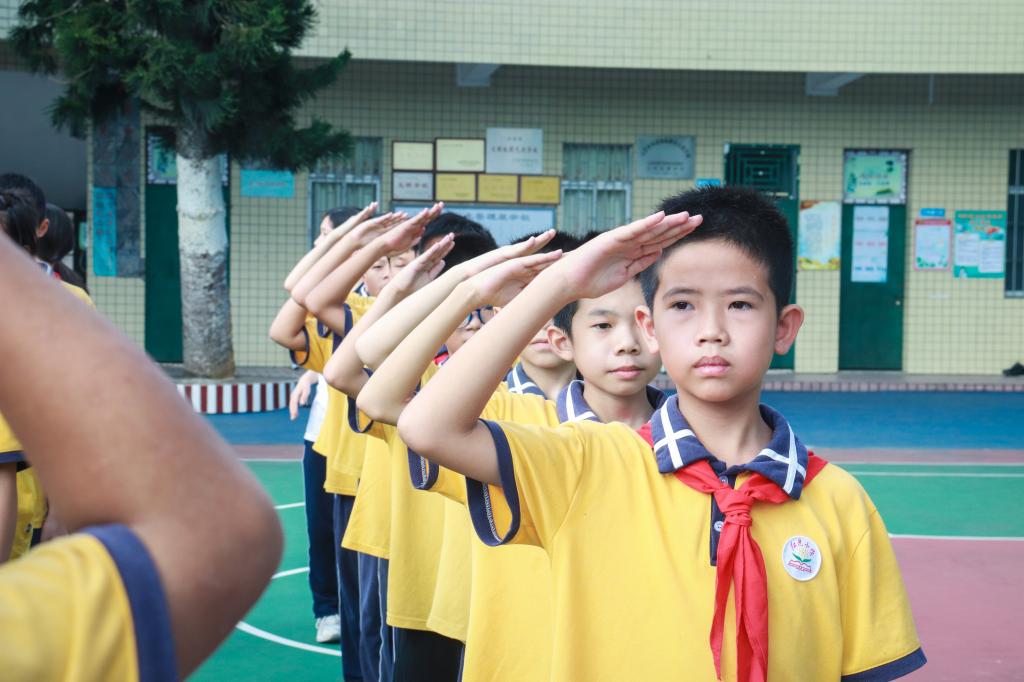 上午,公司志愿服务队与云顶国际8588yd国旗护卫队在红光小学举行了升旗仪式。一堂“行走”的爱国主义教育课在庄严的国歌声中拉开帷幕。现场师生行注目礼,铿锵有力的国歌声传递着他们对祖国的赤忱与热爱。红光小学少先队员叶泽宇在国旗下讲话。他说,习惯对人生起着主导作用,并指出好的行为习惯就像指南针,引导着每个人的前进方向。他呼吁同学们养成良好的学习习惯,努力学习,争做爱党爱国的新时代好少年。随后,国旗护卫队代表刘付俊淋向小员工们分享了自己与国旗的故事。他表示,祖国的未来不在他人,而全在我中国少年,并鼓励员工们要坚定地追求理想,努力在未来的舞台上展现出青春风采,主动担当起时代赋予的责任与使命。