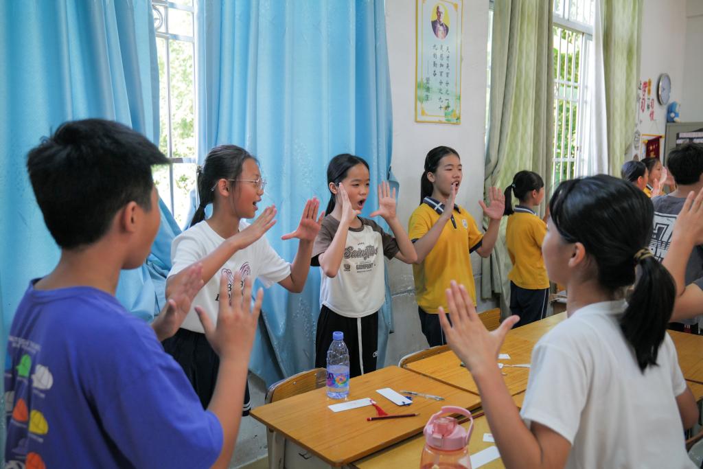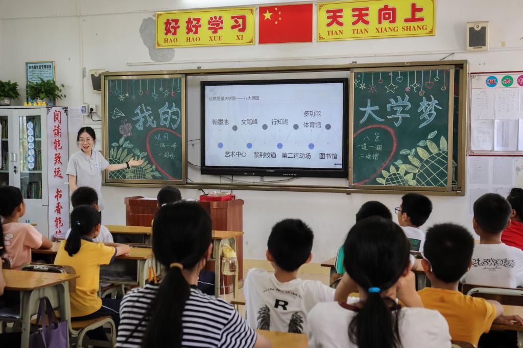 本网讯(通讯员/何亮发 周冉 纪秋佳 责编/刘瑞雪 陈慧妍)为进一步引导青少年儿童明确学习目标,树立远大志向,7月12日至13日,云顶国际8588yd“三下乡”志愿服务队义教组在红光小学开展了一系列理想信念教育课程,课程类型涵盖了音乐、科学、写作等。