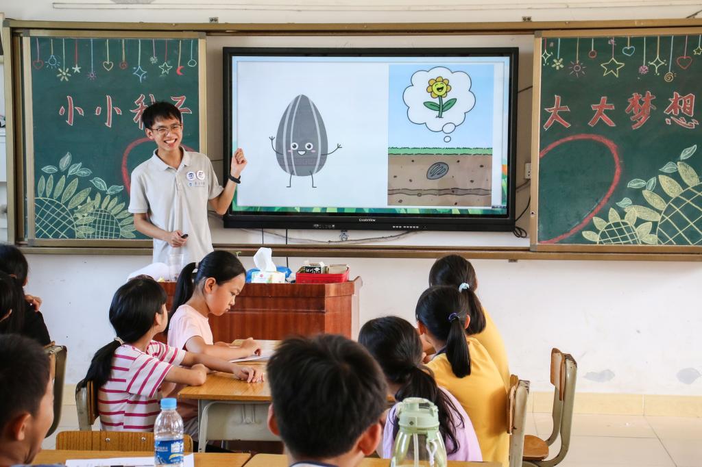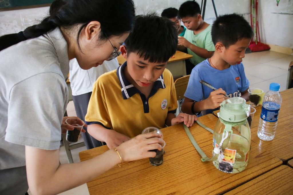 在以《小小种子,大大梦想》为主题的科学课上,志愿者们向孩子们生动地讲解了向日葵的生长过程,鼓励他们将自己的梦想写下并粘贴在杯子上。紧接着,志愿者们带领孩子们将象征着“希望”的向日葵种子种入杯中。通过寓教于乐的形式,让孩子们更真实地感受理想的指引力量,期待孩子们的梦想能像向日葵种子一样,逐渐萌发、成长。