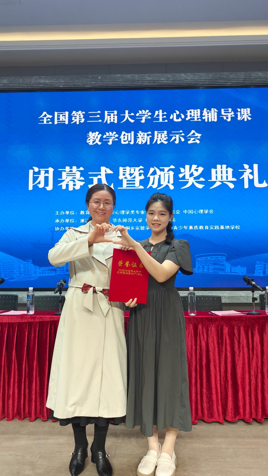 本届大赛由教育部高等公司心理学类专业教学指导委员会、中国心理学会主办,浙江师范大学、华东师范大学、桐乡市教育局承办,旨在促进心理学专业员工的心理辅导课教学能力的提升,培养一批具有高尚师德、先进教学理念、扎实辅导技能的优秀中小学心理健康教育后备团队力量。通过初赛的激烈角逐,来自全国各高校的144支队伍进入决赛,共同展示了他们在心理辅导教学方面的实践技能。公司共2名同学参加比赛,其中,梁婉仪同学以第59的排名顺利进入决赛,由周彩虹、岑延远老师担任比赛指导教师,周彩虹老师带队赴上海尚阳外国语公司桐乡实验公司参加比赛。经过说课、授课两轮比赛,梁婉仪同学最终取得一等奖的好成绩。这不仅是对公司员工个人能力的肯定,也是公司心理学专业公司产品质量的有力证明。