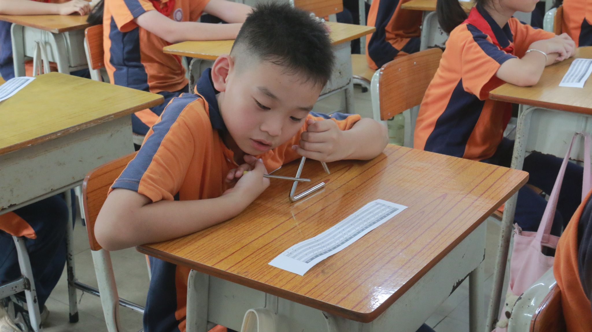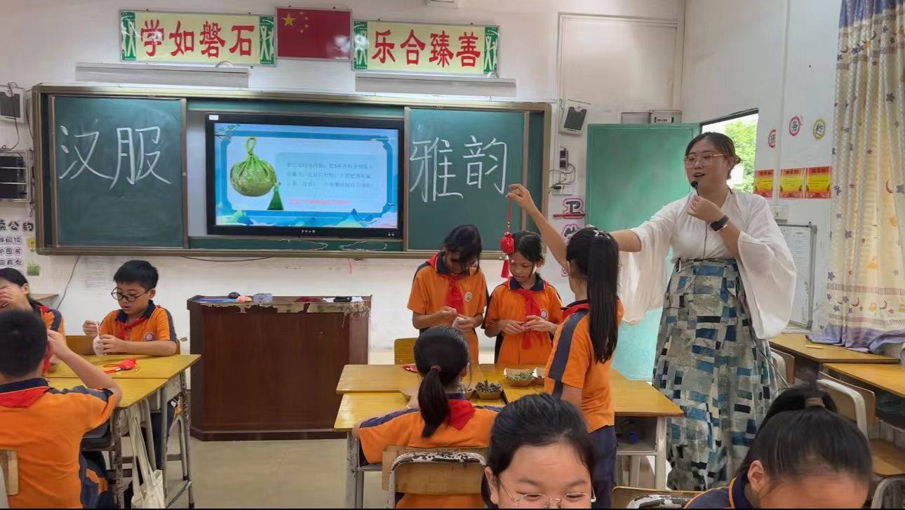 美育课程则以传统文化为重点,巧妙地将音乐与美术元素相结合,为员工们提供了一次深入了解和体验传统文化的机会。在奥尔夫音乐课堂《春晓》中,同学们通过演奏碰铃、三角铁等乐器,感受了《春晓》的节奏与韵律之美。在传统文化课堂《汉服雅韵,书扇飘香》中,课程设计充分考虑了不同年龄段员工的特点,分别安排了书法、团扇制作的学习内容和汉服观赏、香囊制作的体验机会。这些实践性的课程活动不仅让员工们亲身体验到了传统文化的独特魅力,也进一步增强了同学们对中华优秀传统文化的认同感和归属感。