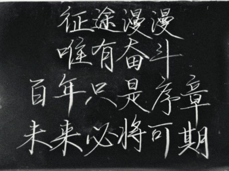 本次活动沿袭了律委会举办多年“三言两语书真情”活动,但不同于以往明信片、小纸条、朋友圈留言等形式,今年公司确定了以写黑板字拍照上传的形式进行。既结合了师范生粉笔字日常练习的特点,作为载体的小黑板也为“三言两语”书写的布局和整体结构提出了潜在的要求。本次活动得到同学们的积极响应,共收集到作品94份。内容包括了学习党史后的感悟、对榜样的景仰、对青春的起誓、对时代的承诺等,苍劲有力的字体,整洁舒适的排版,缤纷灿烂的点缀,磅礴大气的誓词,让人感受到文字与书写的力量。